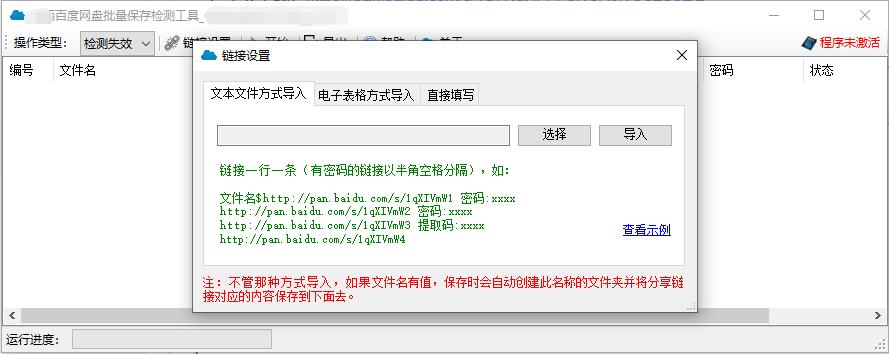 工具提供文本文件、Excel、文本框三种方式,按提示的格式导入即可,导入准备好的链接如图: