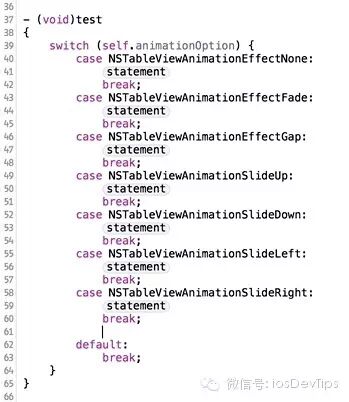 例如,当你输入switch,然后键入一个NSTableViewAnimationOptions类时,该插件会将其可能的取值补全在每一个case之后,如下图所示: