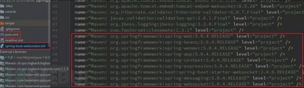 从图中可以看出项目使用Spring Framework 5.0.4并且使用spring-websockets 模块所以猜测可能存在Spring Messaging 远程命令执行漏洞。