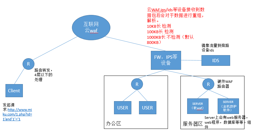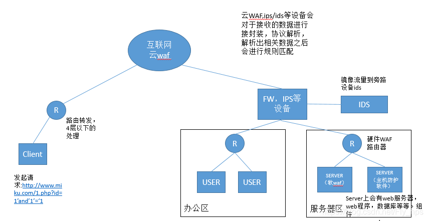 图中可以很清楚的看到,我们的云waf,硬件ips/ids防护,硬件waf,主机防护,软waf以及应用程序所在的位置。