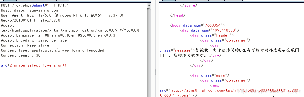我们在阿里云ecs主机上搭建个环境,创建一个存在sql注入漏洞的页面,获取参数从POST上获取,首先我以urlencode的方式提交,查看发现提交的请求被阻断了。