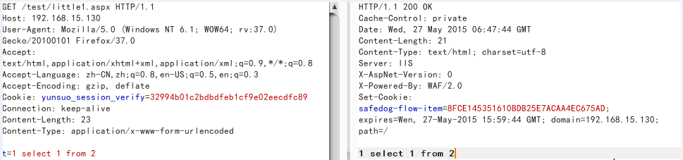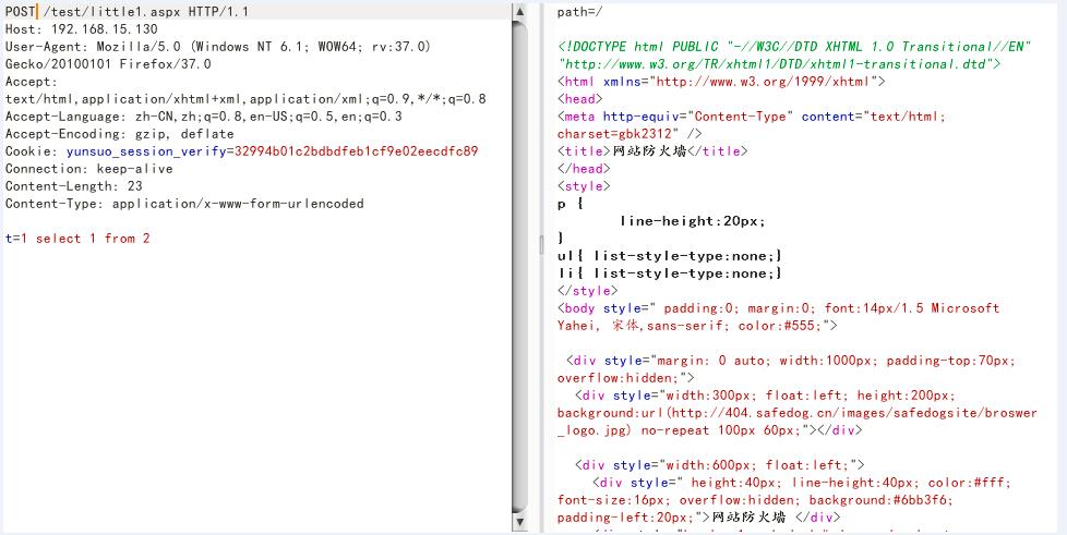 我们创建一个letmetest.aspx的界面获取用户提交的内容,并且将request['t']的内容打印出来。【在服务器上安装了安全狗】 首先我们提交正常的POST请求,发现已经被安全狗阻断了: