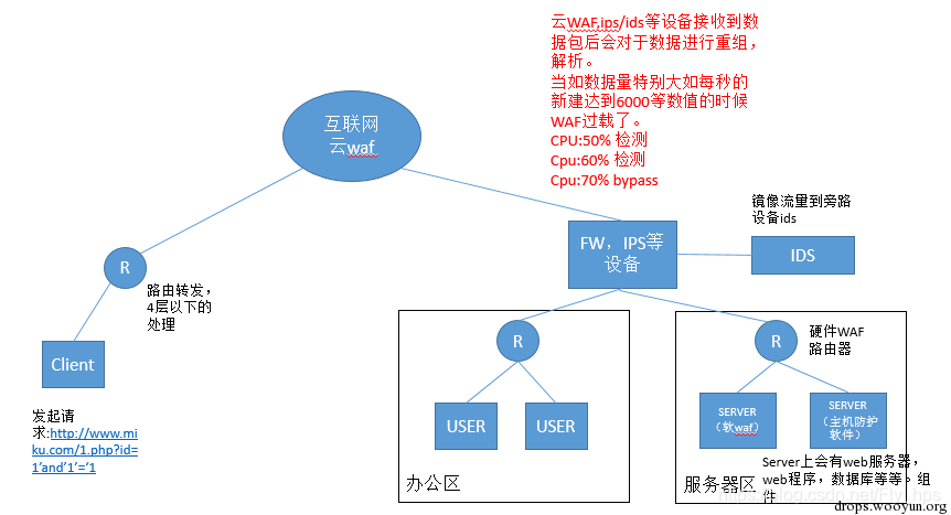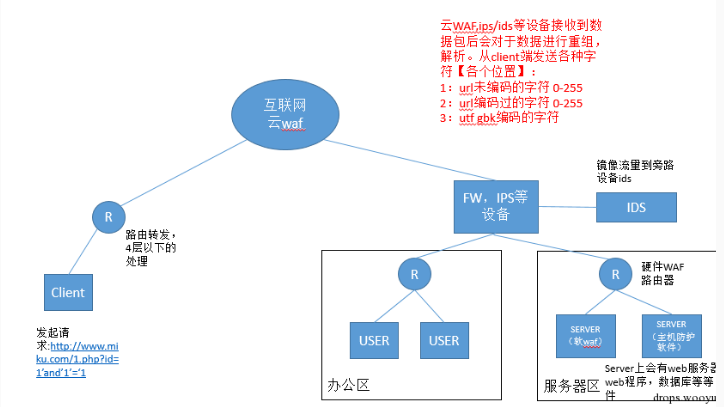 - 3)发送HTTP请求过去,请求会依次经过云WAF,硬件IPS/IDS设备,硬件WAF设备,服务器,web服务器,主机防护软件/软WAF,WEB程序,数据库。 云WAF,硬件IPS/IDS,硬件WAF均有自己处理数据的方式。云WAF与硬件WAF细节上不太清楚,对于硬件IPS有一定的了解。之前在drops上发过一篇文章,文章链接是:http://drops.wooyun.org/papers/4323。