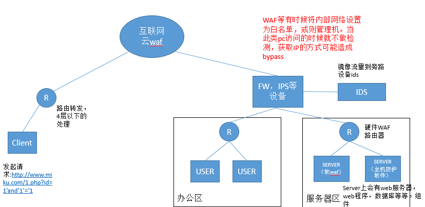 这是一个经典的数通问题,了解WAF在网络空间的位置,我们便可以更清楚的知道使用哪些知识来协助我们进行WAF bypass。