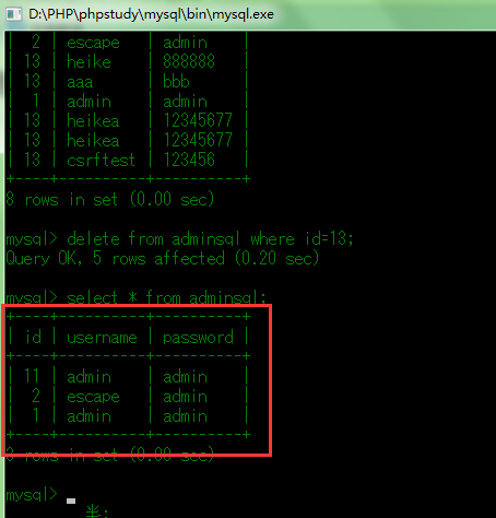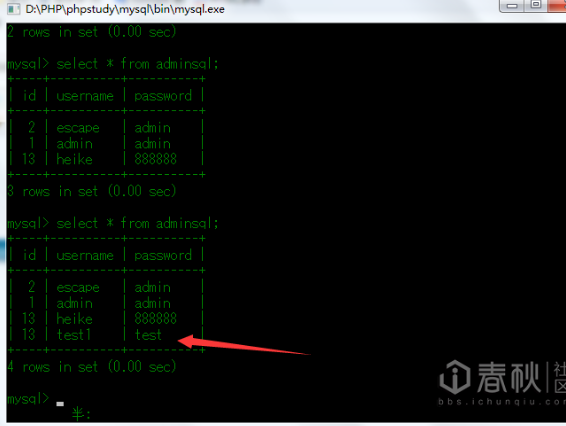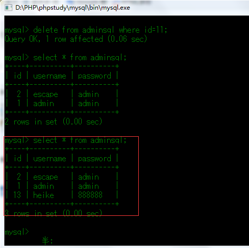 $sql="INSERT INTO `adminsql` (`id` ,`username` ,`password`)VALUES (13 , '$username' , '$password')"; //SQL语句 INSERT INTO(插入) INSERT INTO 后 面的反引号是你的数据表名 就是数据库test下的表