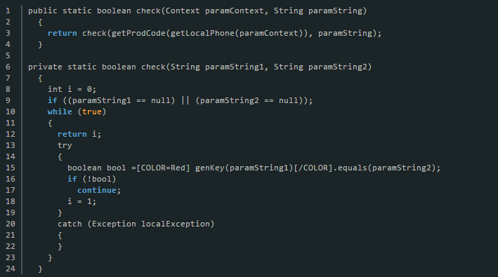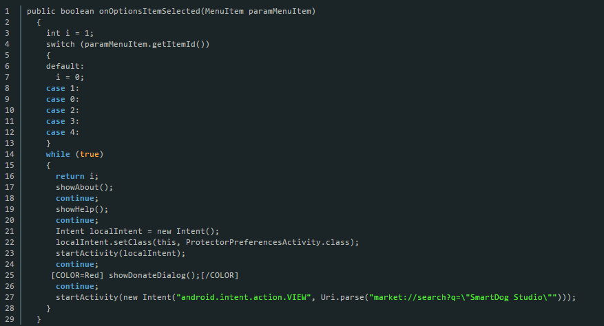 由于反编译不太可能与原码一样,所以上面这段代码流程比较乱。通常这种情况需要通过smali文件来仔细分析,