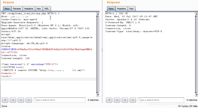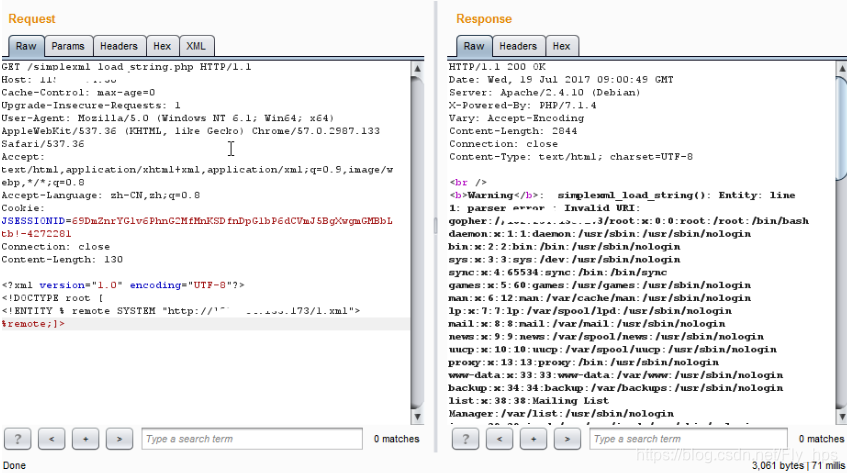 发包过去后,就会请求1.xml,解析这个xml造成XXE攻击,读取etc/passwd并进行base64编码后传给get.php,最后保存到主机上