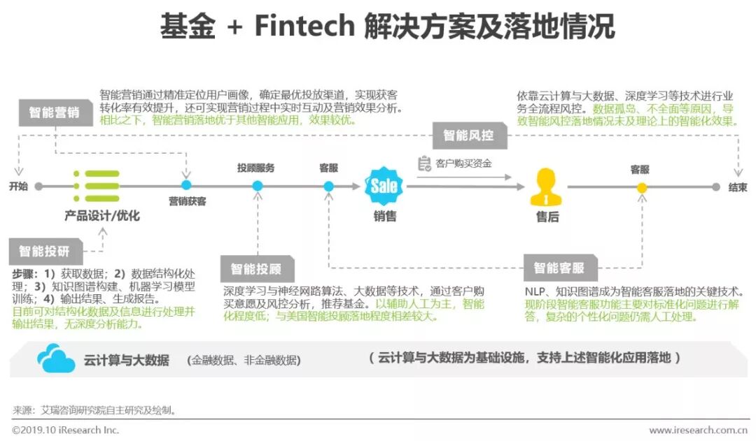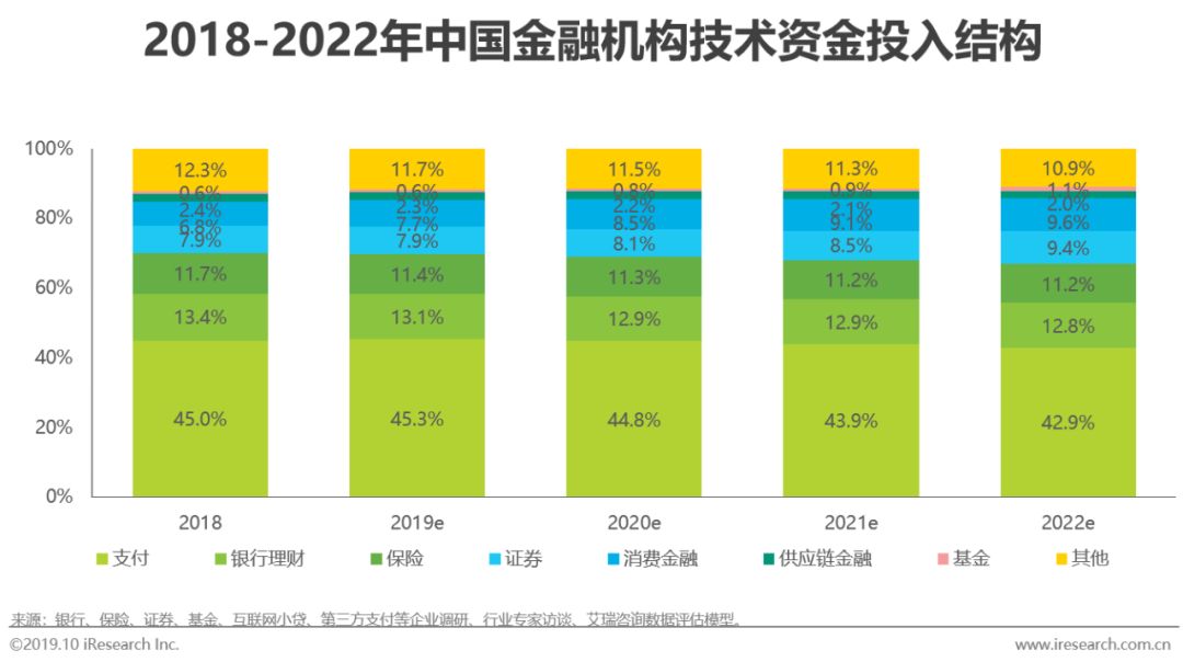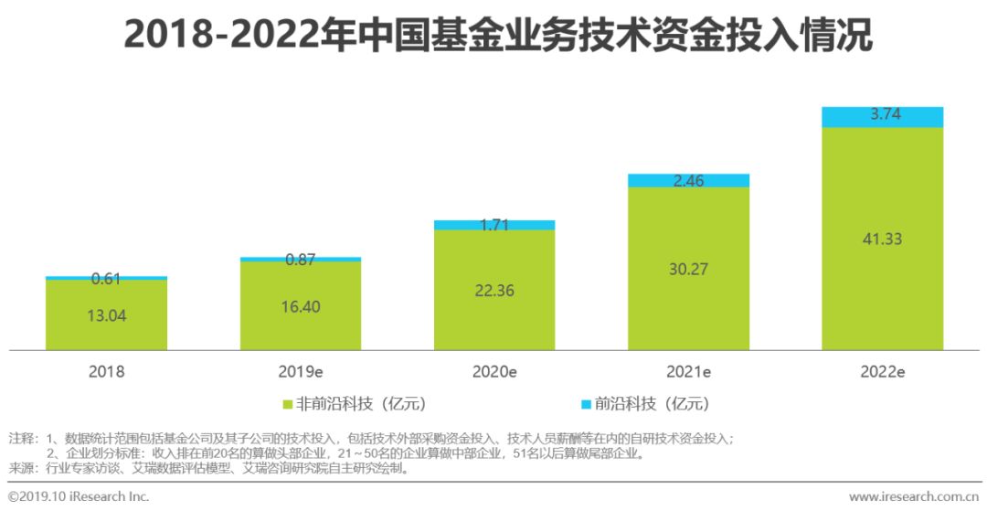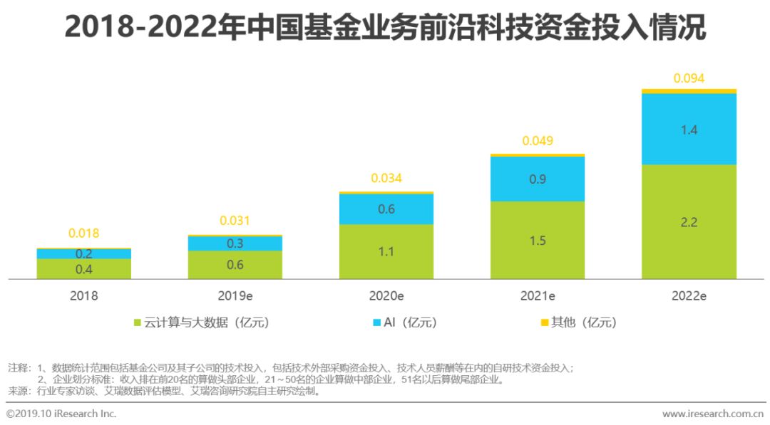 基金:技术资金投入情况IT建设成中尾部公司发力重点;头部公司巩固完善IT建设的同时,稳步增加前沿科技投入目前行业平均水平来看,前沿科技在基金公司每年技术资金投入占比情况:头部企业约为10%;中部企业约为2%;尾部企业几乎为0,IT建设等非前沿科技投入依然是主要部分。鉴于中尾部公司之前对IT建设不足,我们预计至2022年,其IT建设投入增速要高于头部企业。而头部企业依然是前沿科技投入的主力军,中部企业次之;尾部企业伴随着IT建设逐渐完善,预计在2020年前沿科技的资金投入占比将提高至5%,进而实现逐年增长。智能营销、智能投顾等有助于提高获客转化进而提高收益的落地场景是基金科技的主要应用方向,因此前沿科技的增长将以云计算与大数据、AI为主,区块链等需进行场景探索的技术资金投入优先级次之。