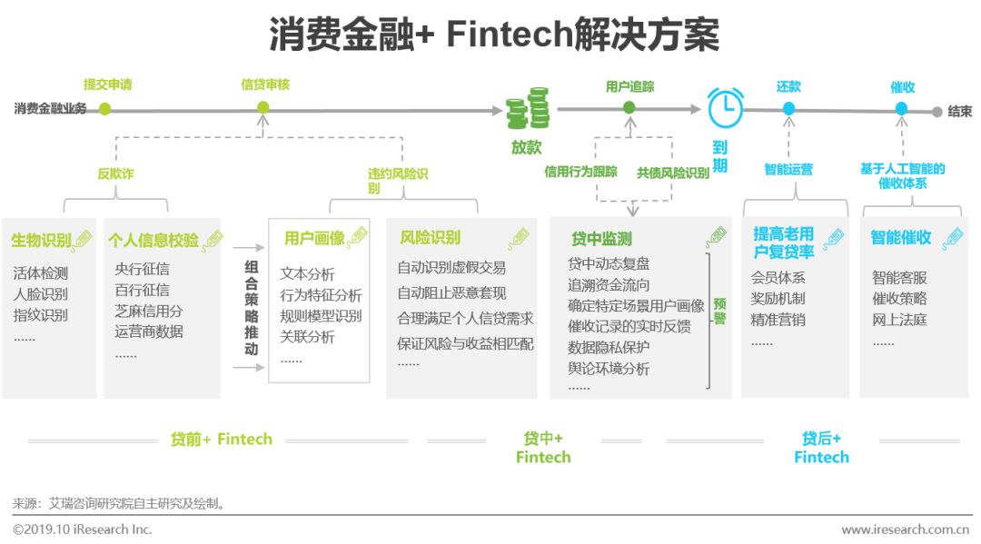 消费金融+Fintech模式及落地情况消费金融贷前、贷中、贷后的全生命周期风险管理消费金融业务的核心是风控,如何做到在贷前、贷中、贷后三个不同环节中,动态地了解贷款用户的还款意愿与还款能力是消费金融企业面临的主要难题之一。目前在用户数据的串联下,头部消费金融企业通过研发大数据分析、生物识别、深度学习等技术已经实现了贷前贷中贷后的全流程风险管理,而中小的消费金融企业往往也会与拉卡拉金科等较大的金融科技平台合作来获取相应的技术支持。