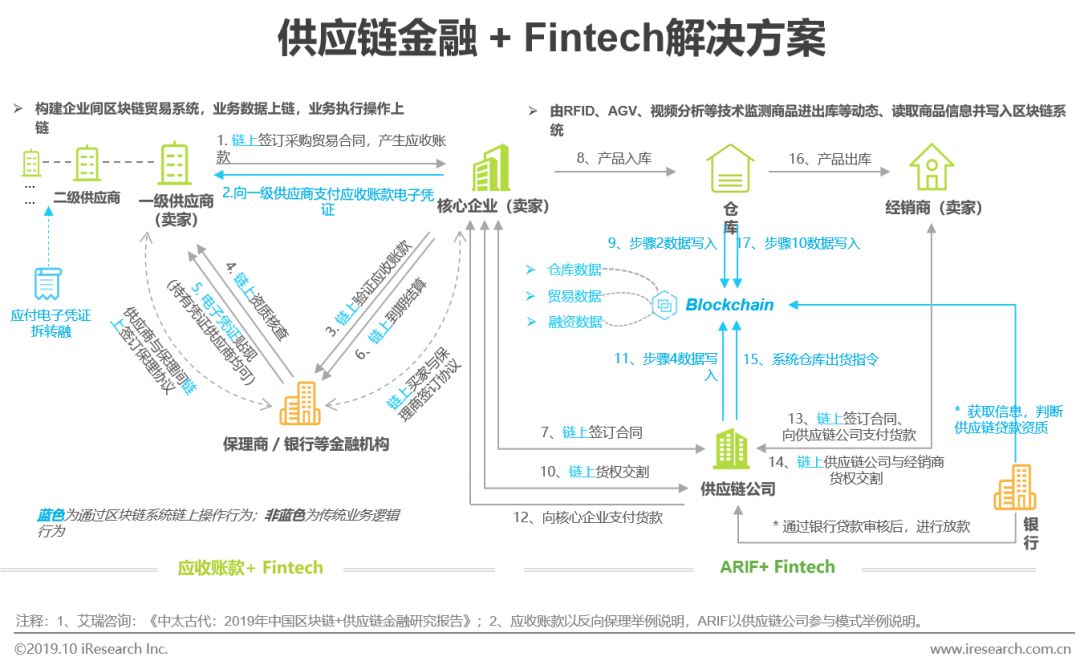 供应链金融+Fintech模式及落地情况构建企业间贸易系统为基础,凭证拆转融为主要创新落地情况:应收账款+Fintech在多数银行,金融科技企业等已有较多落地案例,但仍属于初步落地阶段,下一阶段任务将是寻找促进凭证流转策略、吸引更多企业加入链上网络生态;相比之下,ARIF+Fintech落地稍显落后,仅少数核心企业拥有落地案例。