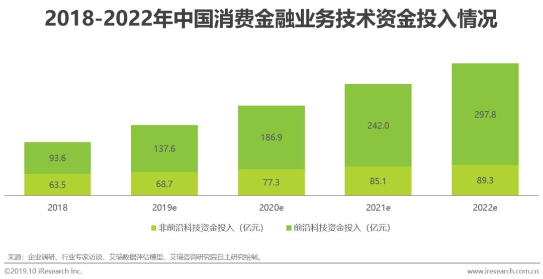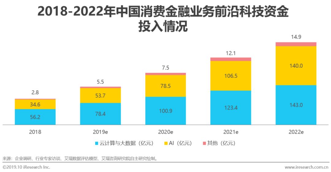 消费金融:技术资金投入情况科技能力高的消费金融平台在完成自身技术系统搭建后,将其形成产品输出给金融生态系统内的合作者更优秀的金融科技能力使平台能够更好地利用其业务中产生的大量数据,定制和优化其产品模型和风控模型,以降低坏账风险、满足用户需求。同时在自身系统构建完毕后将其形成产品,输出给金融生态系统内的所有合作者。消费金融业务2018年技术资金投入达157.1亿元,其中前沿科技投入达93.6亿元。在前沿科技的各项技术中,云计算与大数据是目前占比最高的技术投入,未来人工智能的技术投入占比将逐步提升。