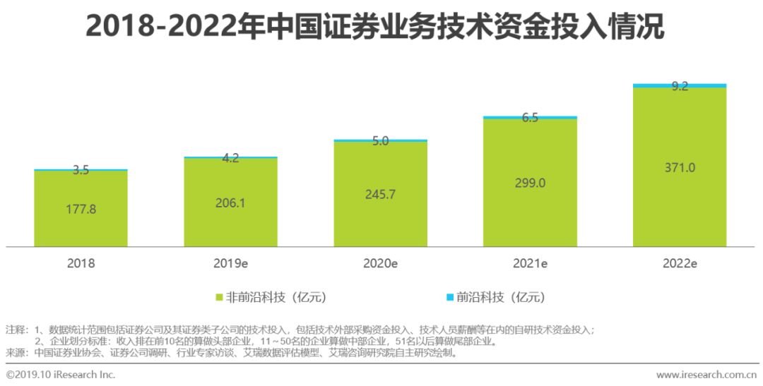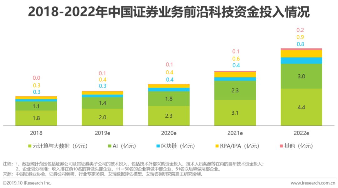 头部证券企业前沿科技资金投入约为中部企业的2~3倍,尾部企业投入几乎为0,而中部企业数量为头部企业数量的4倍左右。一方面头部企业有足够的资金实力布局科技投入;另一方面,头部企业在实现良好可控的基础IT建设后,在监管允许范畴内进行科技化升级探索为寻求业务增长。未来至2022年,我们认为证券业在各项前沿科技投入的增长基本趋稳,单一技术资金投入增长情况不会出现较大波动。云计算与大数据的基础建设,以及AI、RPA/IPA这类应用场景明显的技术将作为整体的重点投入对象,区块链这类以应用探索为主的技术,主要以头部企业进行资金投入为主。