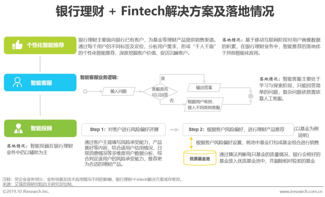 银行理财+Fintech解决方案及落地情况银行理财以智能化应用为主,智能营销效果显著,智能投顾落地效果提升空间较大