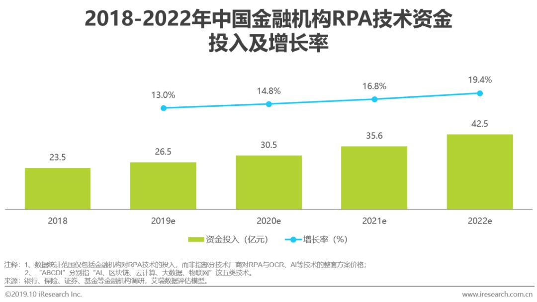 金融RPA价值的逐渐显现RPA将不断丰富金融科技应用场景,并催化AI等技术落地从技术资金投入情况可见,对金融机构而言,RPA与“ABCDI”不在同一战略层级,但从金融科技落地角度看,RPA更像是一枚催化剂,加速了AI等技术与金融业务的融合,如RPA+文本识别应用于合同扫描与关键信息检索分析,丰富了AI落地场景的同时,也让AI与金融业务实现了更深度融合。作为催化剂的同时,RPA自身落地的业务场景也在不断拓展,如:RPA最初只作为财务自动化工具,而后逐渐在清结算、流程化运营等业务场景中被逐渐应用。从技术发展的宏观角度看,RPA在推动金融科技落地方面起到了“过渡”价值,加之RPA自身业务场景的不断丰富,因此在未来几年,金融机构对RPA的投入会逐渐增加。而对金融RPA服务商来说:1)提供“RPA+技术”的综合解决方案会打破金融RPA市场规模瓶颈;2)同样的技术能力下,更懂金融业务的金融RPA服务商会更具竞争力。