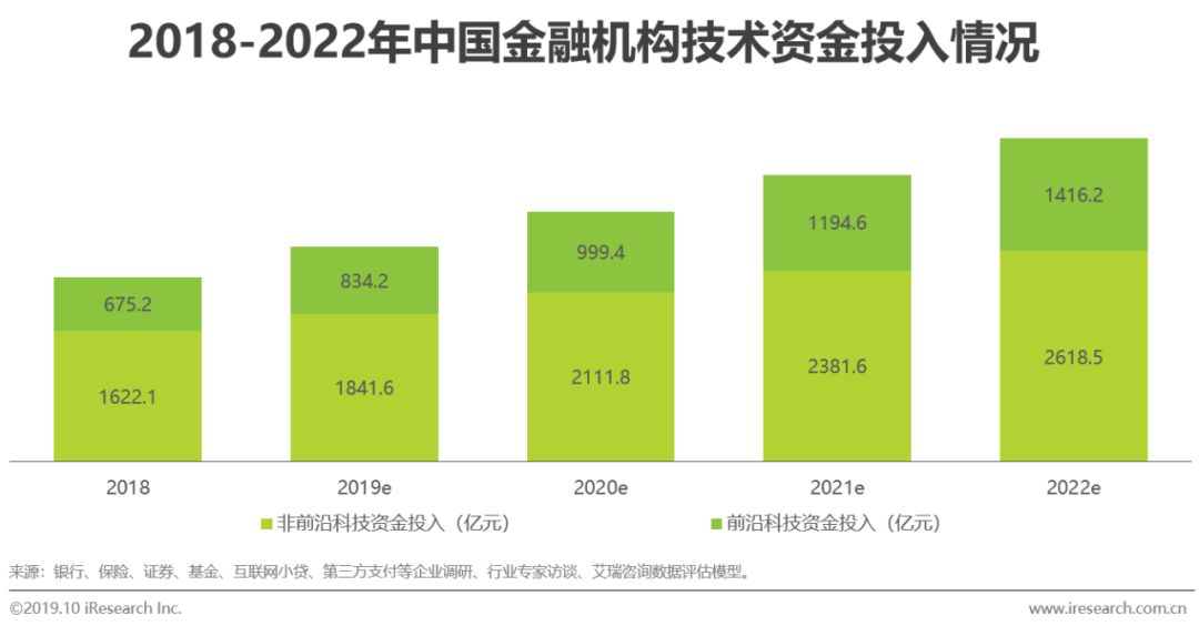 聚焦中国,金融与科技的融合也带动了金融企业与科技企业的融合。2018年我国各类金融机构技术资金投入已达2297.3亿元,其中投入到大数据、人工智能、云计算等为代表的前沿科技资金为675.2亿元,占总体投入比重为29.4%。