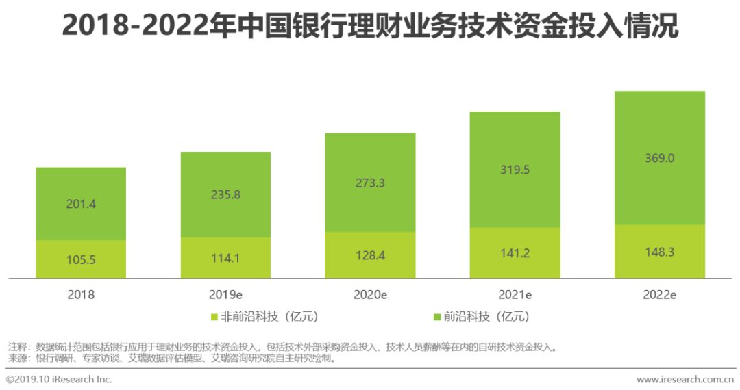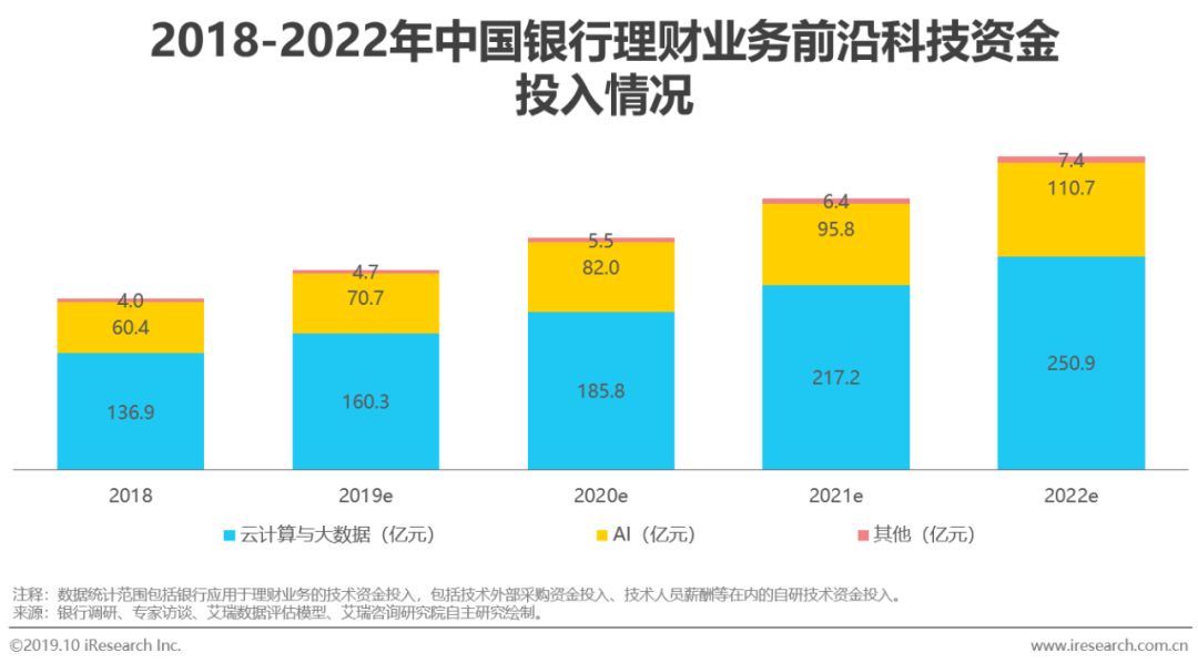 银行理财:技术资金投入情况IT系统投入增速放缓,大数据与AI投入稳步增长除了选择与具备流量优势的互联网金融公司合作,通过自身技术强化与落地应用成为银行理财业务增长关键策略之一。银行信息化建设相对较为成熟,理财业务IT系统资金投入在未来1~3年内的增速将逐渐放缓。目前智能化应用还未成熟但价值前景明朗,银行在构建自有技术团队的同时也会选择商汤、云从这类头部AI服务商进行定制化开发,因此大数据、AI技术的资金投入将继续的稳步增长。银行经过多年的云平台建设与积淀,相比于证券、保险行业要领先很多,因此“大数据与云计算”类别中的云计算技术在未来增速将逐渐放缓。