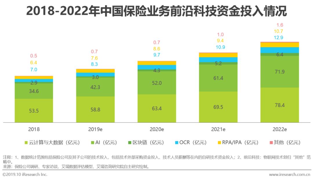 保险:技术资金投入情况“数字场景搭建à智能化落地”成保险科技主要投资方向中尾部保险公司将技术投资重点放在信息化建设,前沿科技投入以头部企业为主。头部企业云计算建设逐渐趋于成熟,对云计算的投入增速将趋缓至微降,中尾部企业的投入增速将逐渐增加。伴随着智能化应用的逐渐发展,AI资金投入增速将会稳步上涨,同时也将带动大数据投入的增长,而IoT可有效扩展场景数据边界,如出车联网、仓储监控、智能家居等场景,将更有效丰富保险数据场景,更全面实现全域数据化,但受限于规模化部署、硬件成本等因素,我们认为在1~3年内,IoT在保险领域的应用仍将处于探索阶段,投入上不会出现大幅增长。RPA/IPA针对规则经常变化的业务,无法给出长期有效的解决方案,但对于规则较为统一业务的RPA/IPA投入将会逐步增长。而区块链在未来几年将主要以场景探索投入为主,更多应用在相互保这类需强化互信关系的业务中。