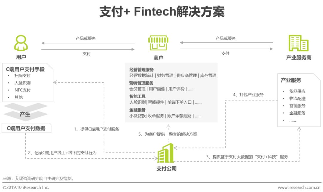 支付+Fintech模式及落地情况产业互联网背景下,前沿科技助力支付企业发力“产业支付”目前,面向个人端的第三方支付工具的渗透率已足够高,用户量增长已逐渐稳定下来。支付宝、财付通两大巨头在个人端占绝对优势,其他支付机构在产业侧寻求新的增量市场成为关键。产业侧的支付需求相较个人端要复杂很多,许多企业面临的最大痛点并不是支付,而是拉新留存、资金周转和货品供应等。因此从支付业务入手,运用云计算、大数据、人工智能等前沿科技为企业提供行之有效的整体解决方案才是支付企业发力“产业支付”关键。