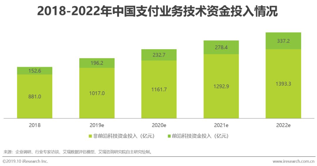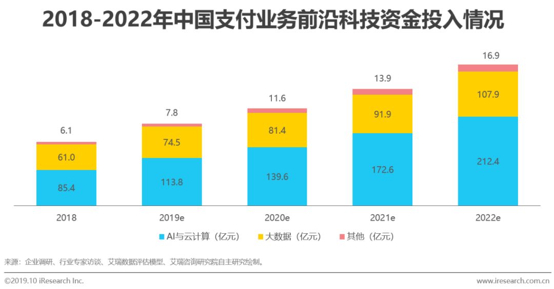 支付:技术资金投入情况我国支付业务技术投入已超千亿,前沿科技投入增长迅速根据央行披露的信息,2018年银行业金融机构共处理电子支付业务1751.92亿笔,非银行支付机构发生网络支付业务5306.1亿笔。我国庞大的电子支付交易体系推动了我国支付业务技术资金的投入规模的增长,2018年我国支付业务技术资金投入达1033.6亿元,其中前沿科技投入仅为152.6亿元,占比较低。但随着“支付+科技”的结合越来越紧密,未来支付企业对前沿科技的资金投入将快速增长,艾瑞预计2022年支付企业前沿科技投入将增长到337.2亿元。其中商汤、云从等人工智能企业的智慧支付解决方案在未来的支付业务前沿科技投入占比中将会迅速提升。