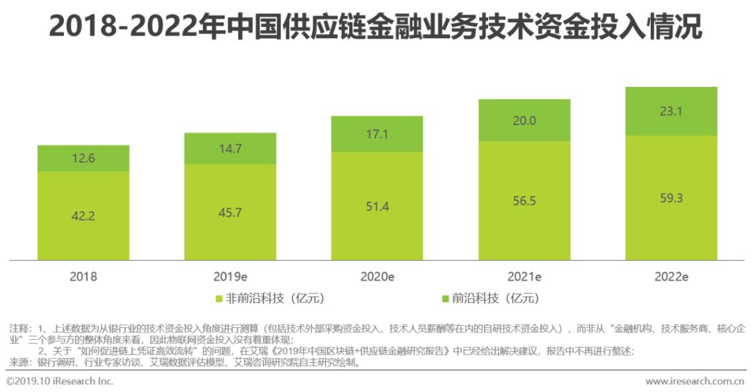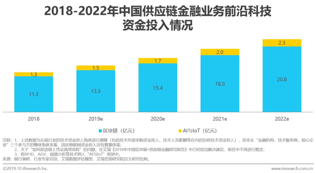 供应链金融:技术资金投入情况联合运营成主流,银行供应链金融区块链资金投入平稳增长从银行角度看,区块链系统成为供应链金融科技的主要投入,且无论是头部的国有大行及商业银行,还是中尾部的地方银行、民营银行等,均对区块链供应链金融有所投入。目前虽有“构建区块链生态网络、如何促进凭证高效流转”等难题的存在,但通过对银行调研反馈显示:行业整体对区块链在供应链金融业务中的应用前景较为看好,同时分析目前联合运营逐渐成为主流(联合运营:金融机构提供资金、技术商提供技术支持、核心企业提供贸易数据,三方分润),银行将更多以资金方参与其中,在现有基础上,我们预估银行供应链金融业务对区块链技术投入将稳定在13%~14%左右的增速,不会出现较大波动。仅部分银行会参与ARIF+IoT全栈系统建设(如:背靠核心企业的民营银行),但是这类投入仍然主要以核心企业、仓促物流公司或技术服务商为主。