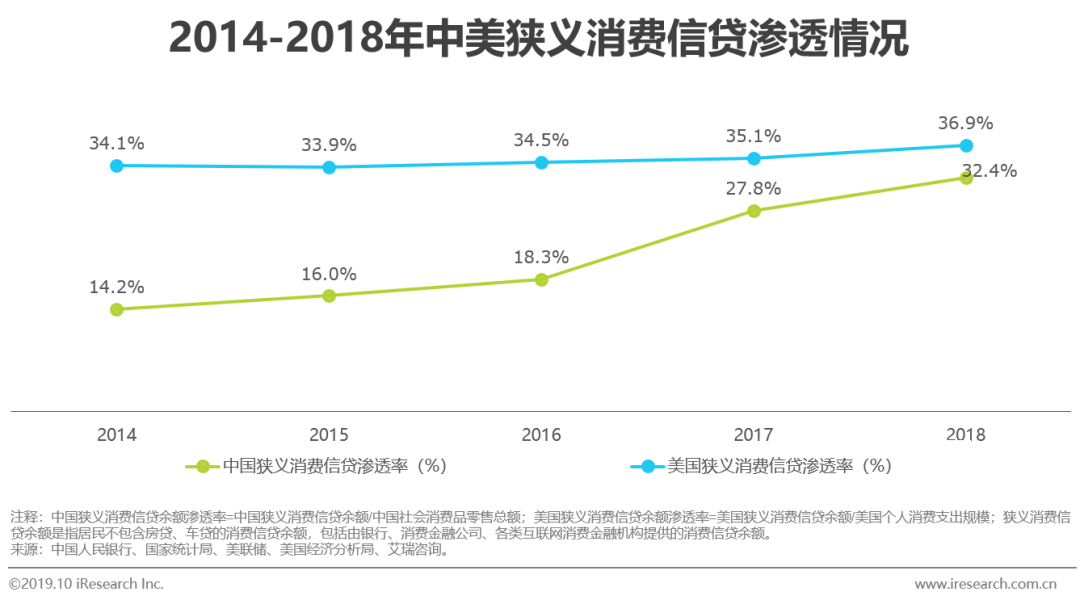 中国金融科技的弯道超车中国尚未成熟的金融市场给予金融科技快速发展的土壤与欧美等发达国家相比,我国金融基础要薄弱许多,但正是我国金融市场尚未成熟这一特点给予了我国金融科技快速发展的土壤。以中美狭义消费信贷渗透情况对比为例,2016年中国狭义消费信贷渗透率仅为18.3%,与同期美国34.5%的狭义消费信贷渗透率相比差距巨大。但随着2017年开始中国金融科技行业的爆发,中国狭义消费信贷渗透率在2016-2018短短两年的时间内完成了从18.3%到32.4%的增长,大幅缩小了我国与美国普惠金融进程之间的差距。从全球金融科技投资分布情况来看,2014年中国金融科技企业融资规模仅占全球的3.1%,但到2018年中国金融科技企业融资规模已占全球的16.4%,增速远超欧美等地区。