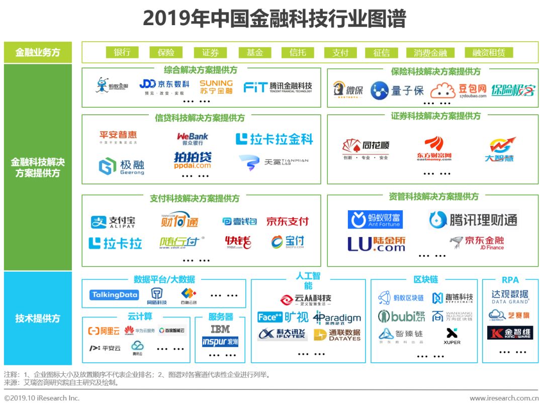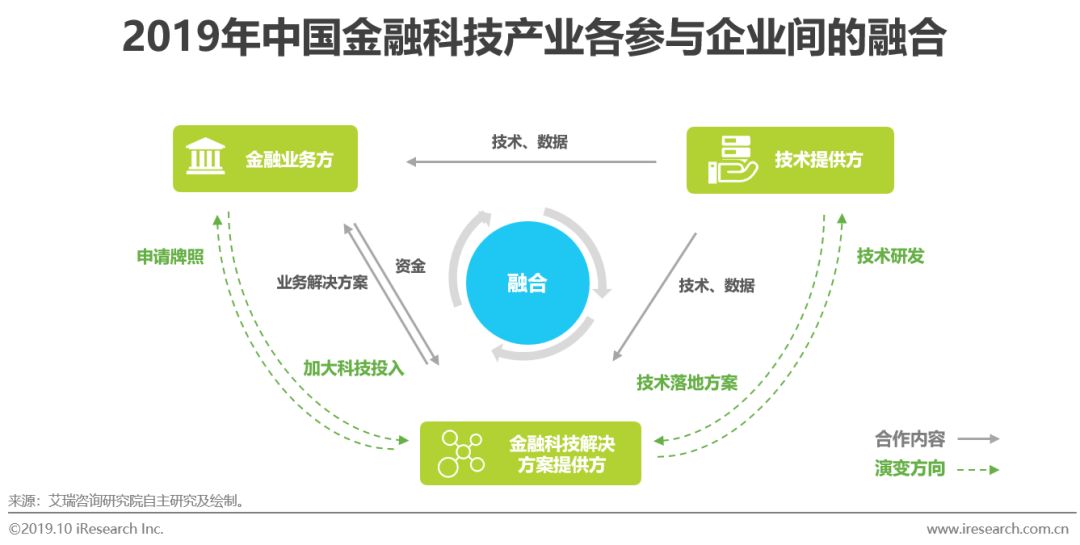 融合的开始金融企业与科技企业不再泾渭分明中国金融科技市场的参与企业按各自侧重点不同,可以分为三类:第一类,金融业务开展方,这类企业主要指持牌开展金融业务的银行、证券、保险等金融机构;第二类,技术提供方,这类企业主要指专注研发人工智能、大数据、云计算等前沿科技底层技术的科技研发公司;第三类,金融科技解决方案提供方,这类企业主要指将前沿科技与金融业务相结合,为金融机构提供可落地的业务解决方案的科技公司。值得一提的是金融与科技的融合也带动了金融企业与科技企业的合作融合,目前这三类参与者的边界正变得越来越模糊。技术提供方正努力补齐金融业务能力的短板,为金融机构提供从单一技术到整体业务的科技升级服务;金融科技解决方案提供方一方面在加强前沿科技的研发,一方面在申请金融牌照,在金融业务与技术两方面发力;而金融业务方正加大前沿科技的研发投入,部分头部金融机构已经开展了面向同业的技术输出服务。