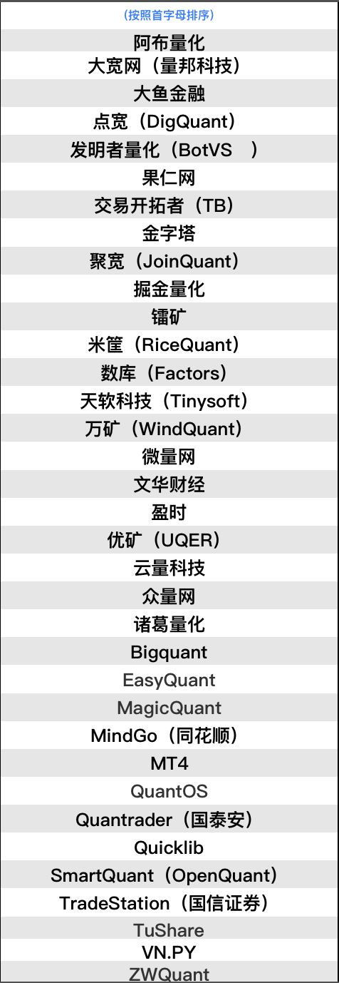 截止目前,公众号统计到国内的量化平台,有30+之多: