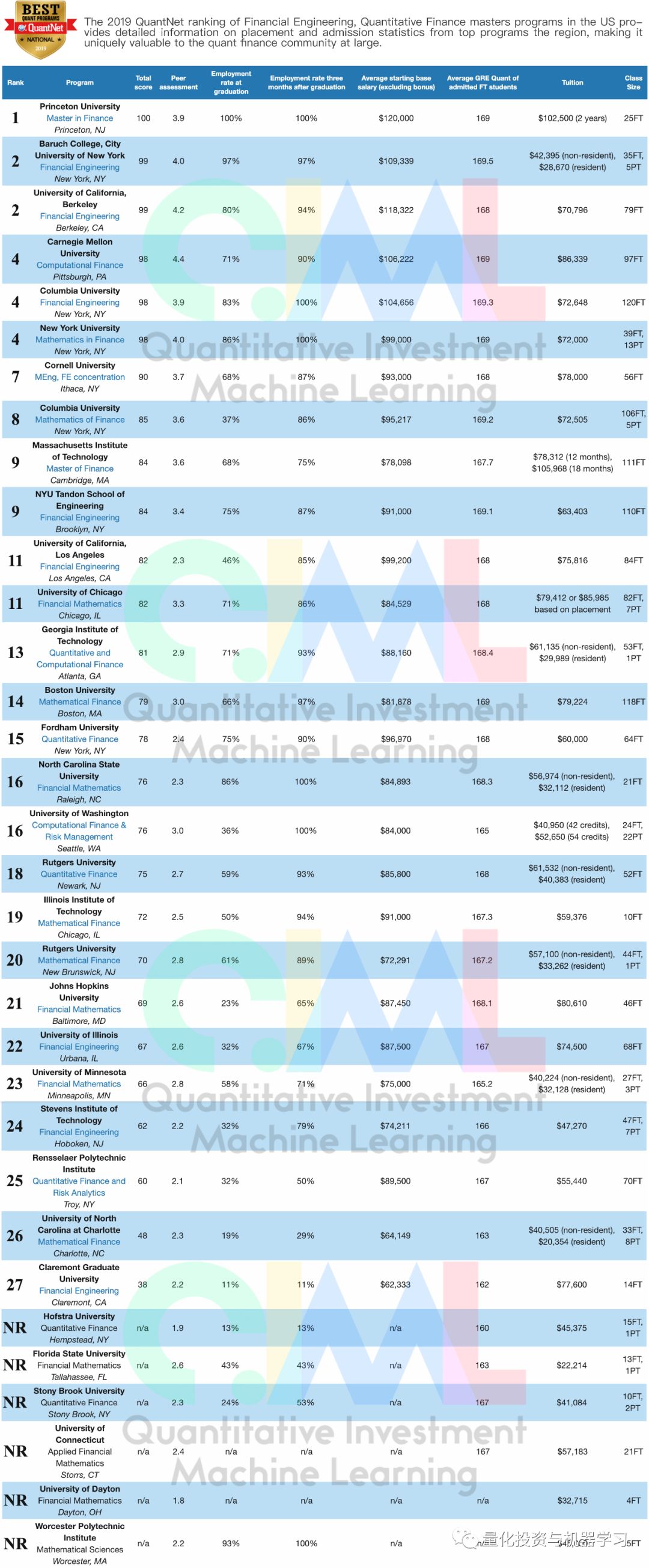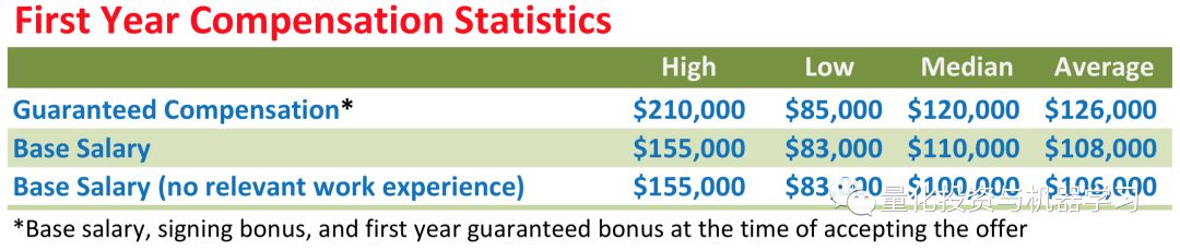 同时巴鲁克学院(Bernard M.Baruch College,CUNY)2016—2018MFE就业分析报告显示:金融工程方向的毕业生第一年薪资平均为11万美金。金工我们会在后文详细说。