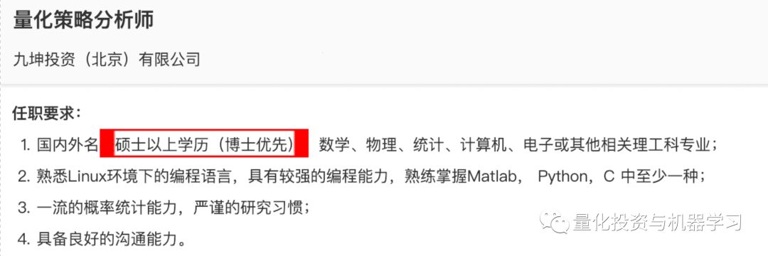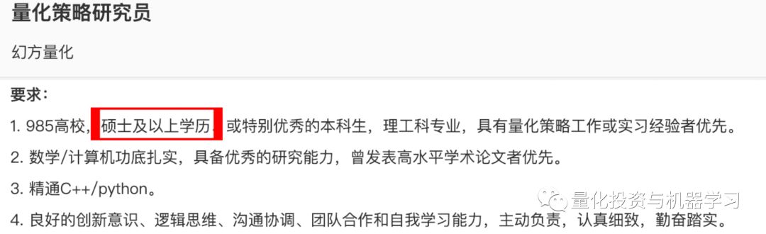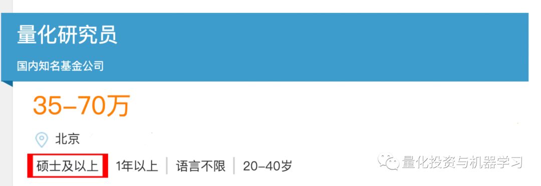 从上文的一些结论,我们看到统计并不是很准确。不过从公众号这几年对行业的观察来看,大专学历首先pass,如果非要给个标准,那么硕士是一个进门槛。公众号在这里不讨论学历是否决定能力,大多数机构就是这么要求的,只有进了门,再说其他。