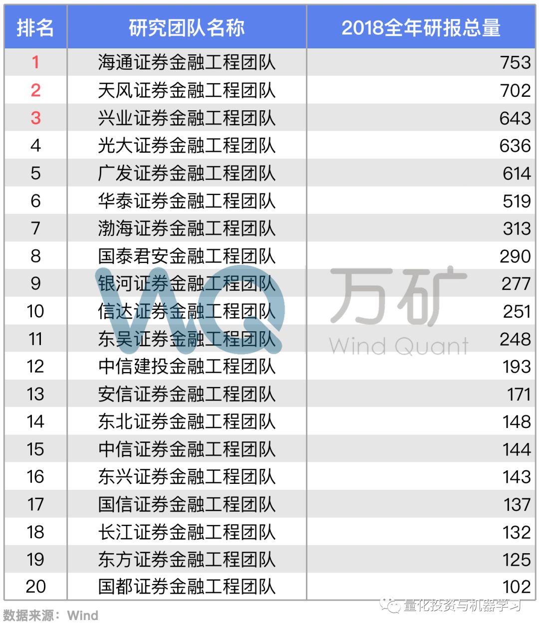 2018全年,海通证券、天风证券、兴业证券的金融工程团队发布的研报总量位居前三。