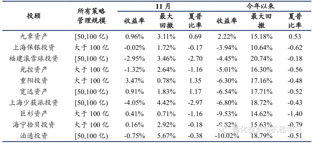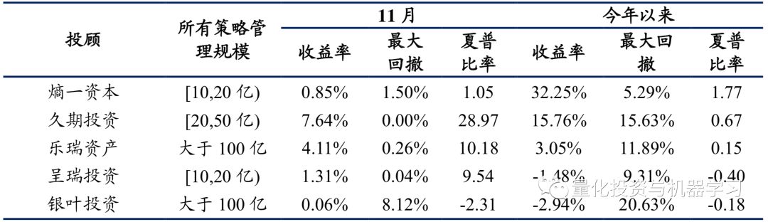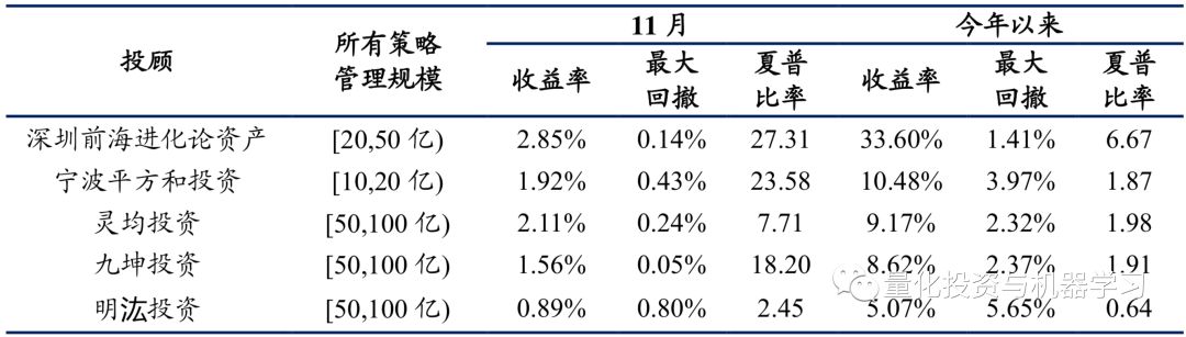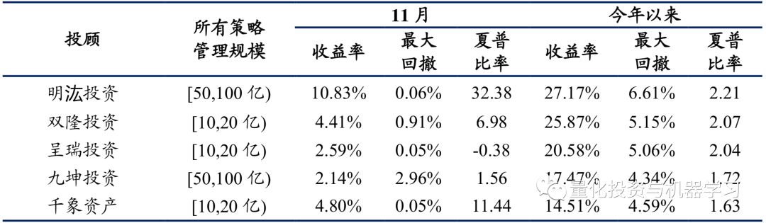 管理期货:截止11月纳入统计的管理期货策略管理人共 12 家,今年以来均取得正收益,排名前五的分别为明汯投资、双隆投资、呈瑞投资、九坤投资和千象资产,这 5家管理人在 11 月均取得较好的正收益。