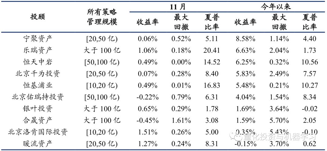 债券基金:截止11月纳入统计的债券基金管理人共 20 家,今年以来收益超过 5%的分别为宁聚资产、乐瑞资产、恒天中岩、北京千为投资和恒基浦业。今年以来回撤控制较好的为恒基浦业和恒天中岩,均控制在 0.5%以下。管理规模大于100 亿的管理人有乐瑞资产、银叶投资、合晟资产和上海茂典资产,仅上海茂典资产今年以来有 1.18%的亏损。