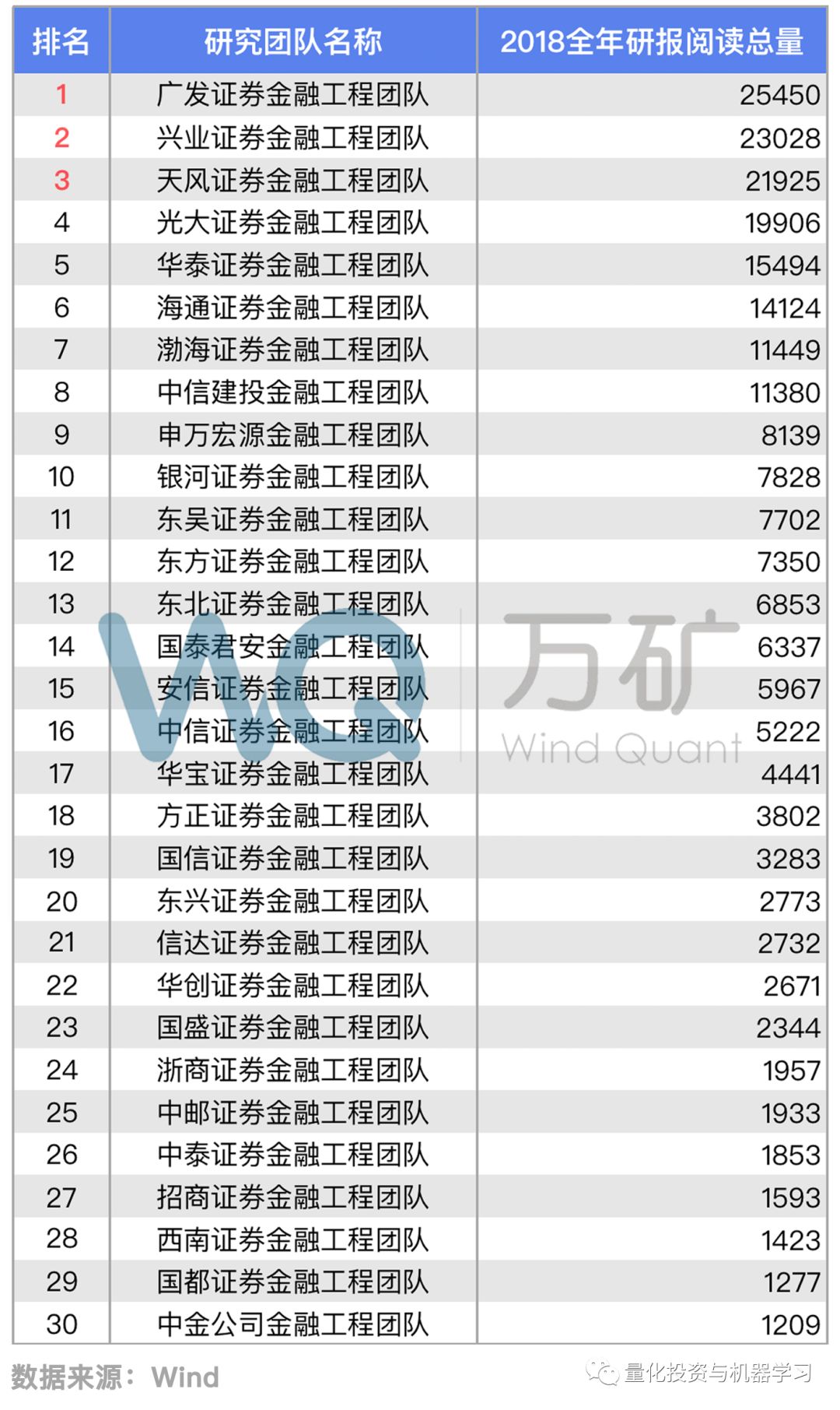 2018全年,广发证券、兴业证券、天风证券金融工程团队的研报阅读总量位居前三。