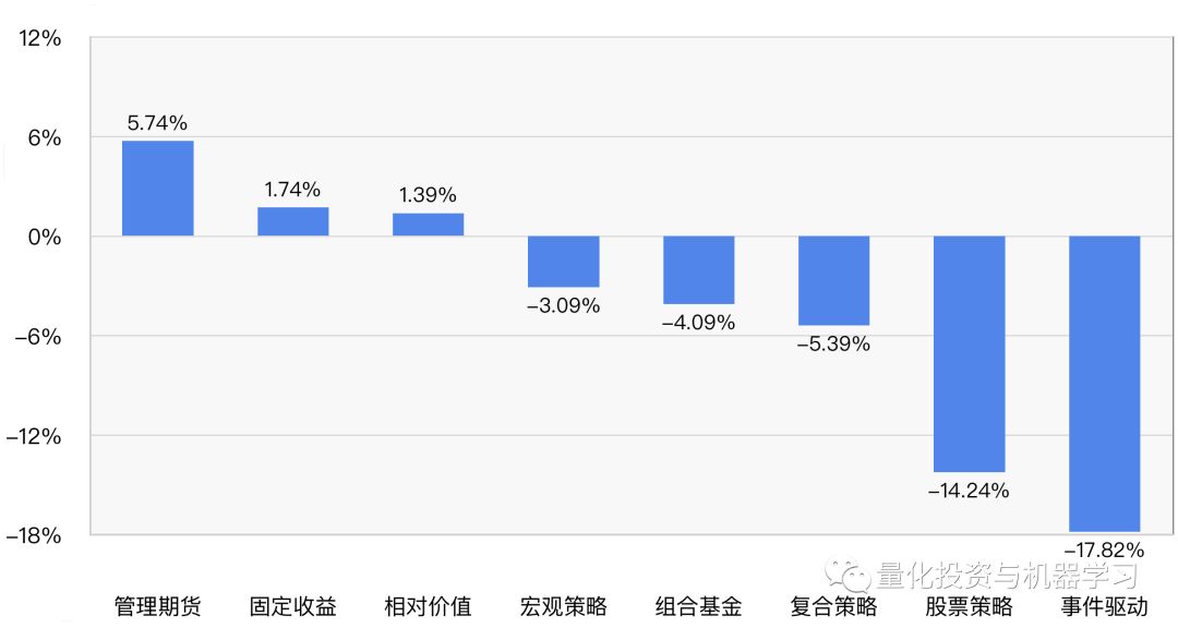 根据私募排排网数据:整个2018年,截至12月21号,表现最好的策略为管理期货策略,平均收益率为3.88%,其次是固定收益的1.76%,而股票策略以-16.50%的表现,排名倒数第二,仅好于事件驱动策略的-19.12%。