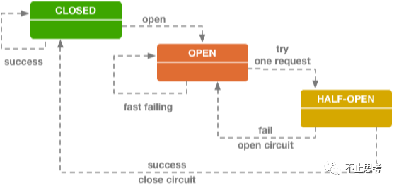 这个模式是需要系统在设计之初,就要把熔断措施考虑进去。当系统出现问题时,如果短时间内无法修复,系统要自动做出判断,开启熔断开关,拒绝流量访问,避免大流量对后端的过载请求。系统也应该能够动态监测后端程序的修复情况,当程序已恢复稳定时,可以关闭熔断开关,恢复正常服务。 -