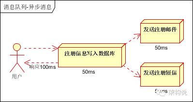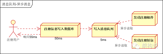 按照以上约定,用户的响应时间相当于是注册信息写入数据库的时间,也就是50毫秒。注册邮件,发送短信写入消息队列后,直接返回,因此写入消息队列的速度很快,基本可以忽略,因此用户的响应时间可能是50毫秒。因此架构改变后,系统的吞吐量提高到每秒20 QPS。比串行提高了3倍,比并行提高了两倍。
