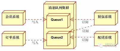 (2)扩展流程(发短信,配送处理)订阅队列消息。采用推或拉的方式获取消息并处理。