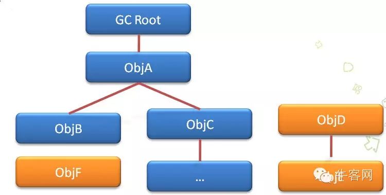 根搜索算法是从离散数学中的图论引入的,程序把所有的引用关系看作一张图,从一个节点GC ROOT开始,寻找对应的引用节点,找到这个节点以后,继续寻找这个节点的引用节点,当所有的引用节点寻找完毕之后,剩余的节点则被认为是没有被引用到的节点,即无用的节点。