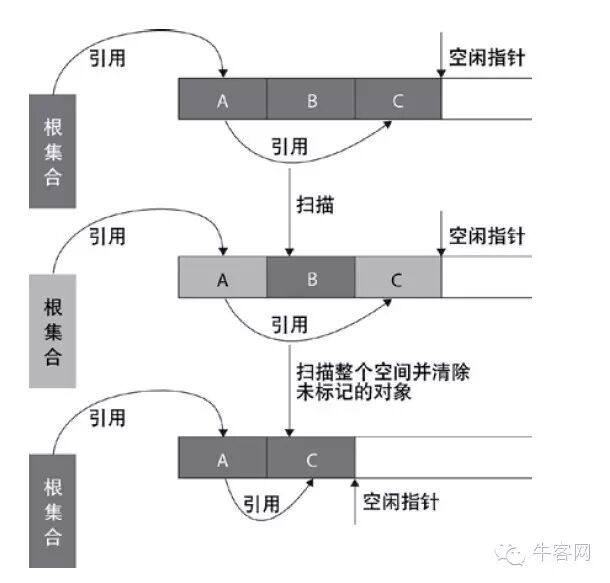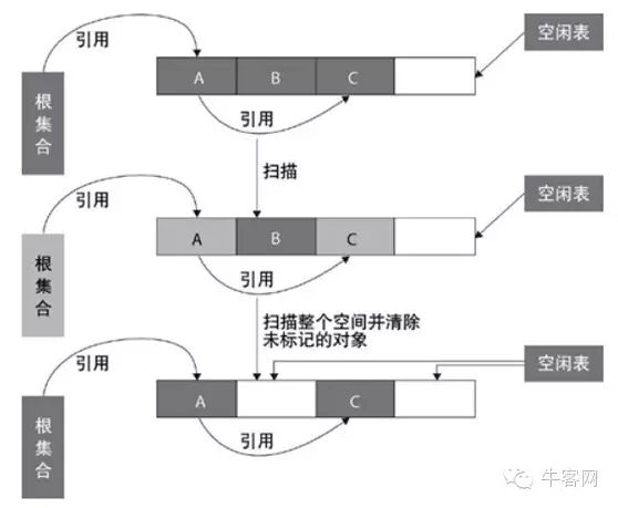 标记-清除算法采用从根集合进行扫描,对存活的对象对象标记,标记完毕后,再扫描整个空间中未被标记的对象,进行回收,如上图所示。标记-清除算法不需要进行对象的移动,并且仅对不存活的对象进行处理,在存活对象比较多的情况下极为高效,但由于标记-清除算法直接回收不存活的对象,因此会造成内存碎片。