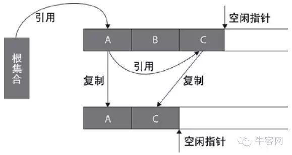 该算法的提出是为了克服句柄的开销和解决堆碎片的垃圾回收。它开始时把堆分成 一个对象 面和多个空闲面, 程序从对象面为对象分配空间,当对象满了,基于copying算法的垃圾 收集就从根集中扫描活动对象,并将每个 活动对象复制到空闲面(使得活动对象所占的内存之间没有空闲洞),这样空闲面变成了对象面,原来的对象面变成了空闲面,程序会在新的对象面中分配内存。一种典型的基于coping算法的垃圾回收是stop-and-copy算法,它将堆分成对象面和空闲区域面,在对象面与空闲区域面的切换过程中,程序暂停执行。