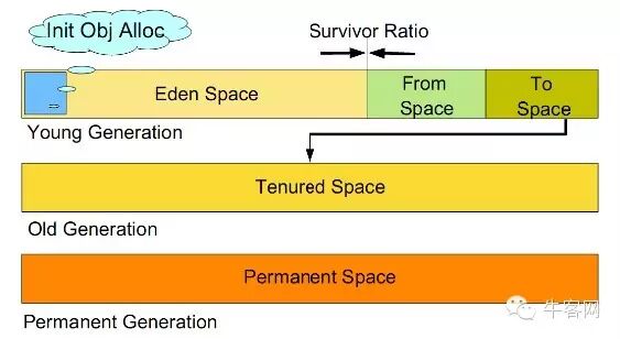 2.新生代内存按照8:1:1的比例分为一个eden区和两个survivor(survivor0,survivor1)区。一个Eden区,两个 Survivor区(一般而言)。大部分对象在Eden区中生成。回收时先将eden区存活对象复制到一个survivor0区,然后清空eden区,当这个survivor0区也存放满了时,则将eden区和survivor0区存活对象复制到另一个survivor1区,然后清空eden和这个survivor0区,此时survivor0区是空的,然后将survivor0区和survivor1区交换,即保持survivor1区为空, 如此往复。