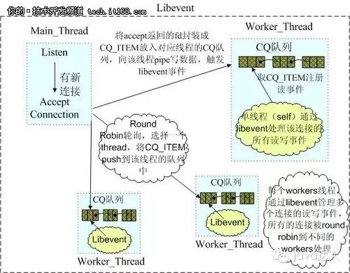 Memcached是多线程,非阻塞IO复用的网络模型,分为监听主线程和worker子线程,监听线程监听网络连接,接受请求后,将连接描述字pipe 传递给worker线程,进行读写IO, 网络层使用libevent封装的事件库,多线程模型可以发挥多核作用,但是引入了cache coherency和锁的问题,比如,Memcached最常用的stats 命令,实际Memcached所有操作都要对这个全局变量加锁,进行计数等工作,带来了性能损耗。