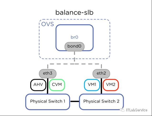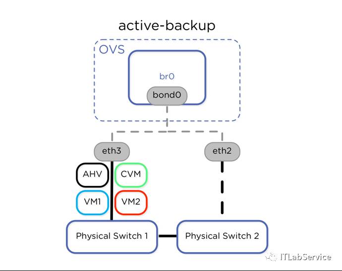 主备模式,这是AHV的默认负责均衡策略。也就是2块万兆网卡只有1块有流量通过,另外1块万兆网卡无任何流量通过,只有在活动的网卡出现故障时,备用网卡才会成为活动网卡承载网络流量,不需要在交换机进行任何配置,但是使用率只有50%。具体如下图所示。