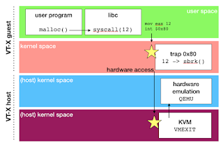 To provide more abstraction, a Virtual Machine do rely on hardware capability (typically: intel VT-X) to offer yet another level of interruption based isolation. Let's see how malloc will operate when application runs inside a VM :