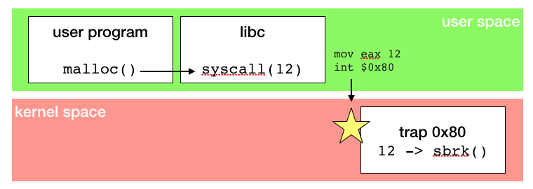 - application calls libC's malloc which actually invoke system call number 12 by triggering an interruption.