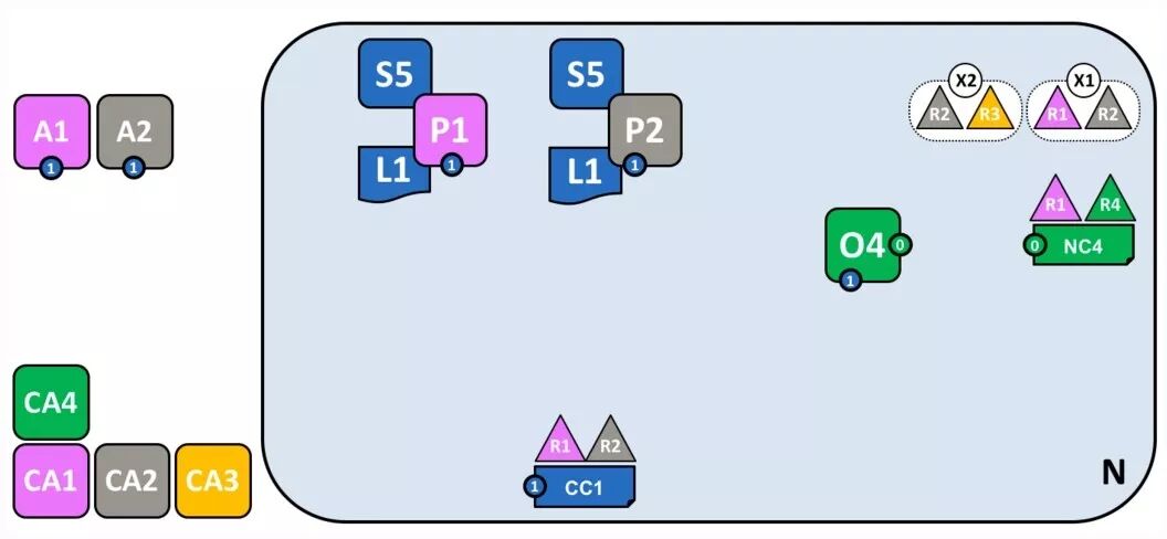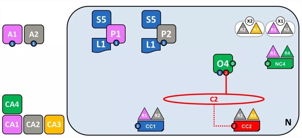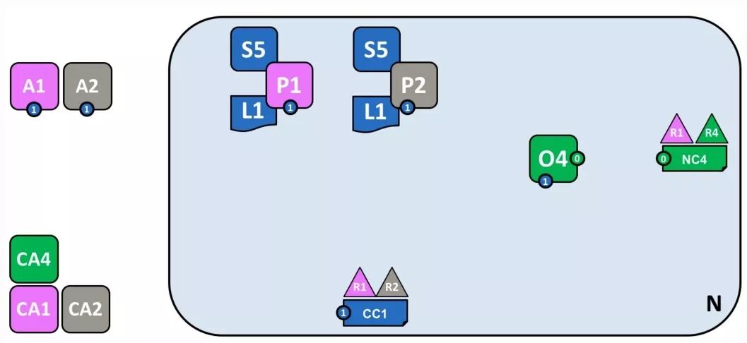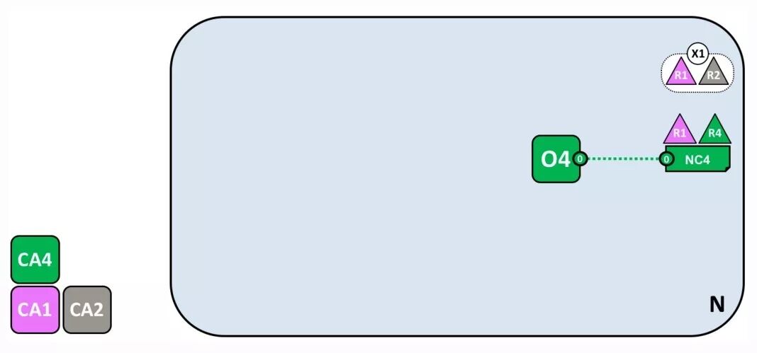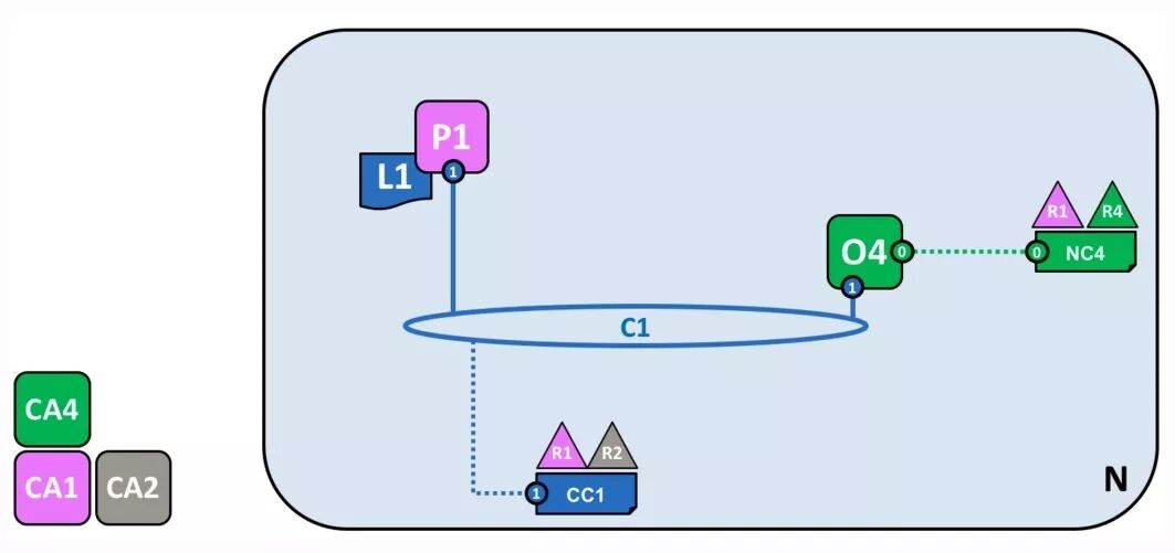 放眼过去,是不是觉得很杂乱?不要急,接下来 Fabric 会告诉我们怎么一步步形成这样的复杂体系结构。先来看图中的 R4 以及它的网络配置文件 NC4,以及排序服务O4,和提供身份服务的 CA4。NC4 包含初始网络管理能力设置的策略。简单点说,就是 R4 有权配置网络。CA 的功能比较简单,基本上众所周知,就不再赘述了。