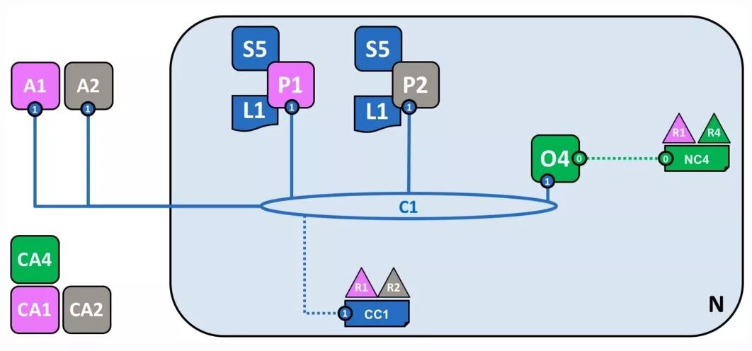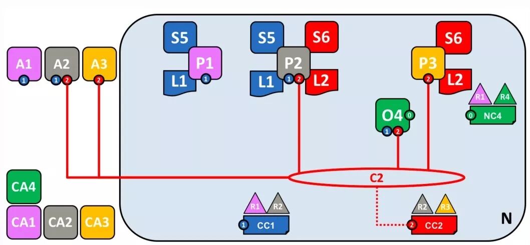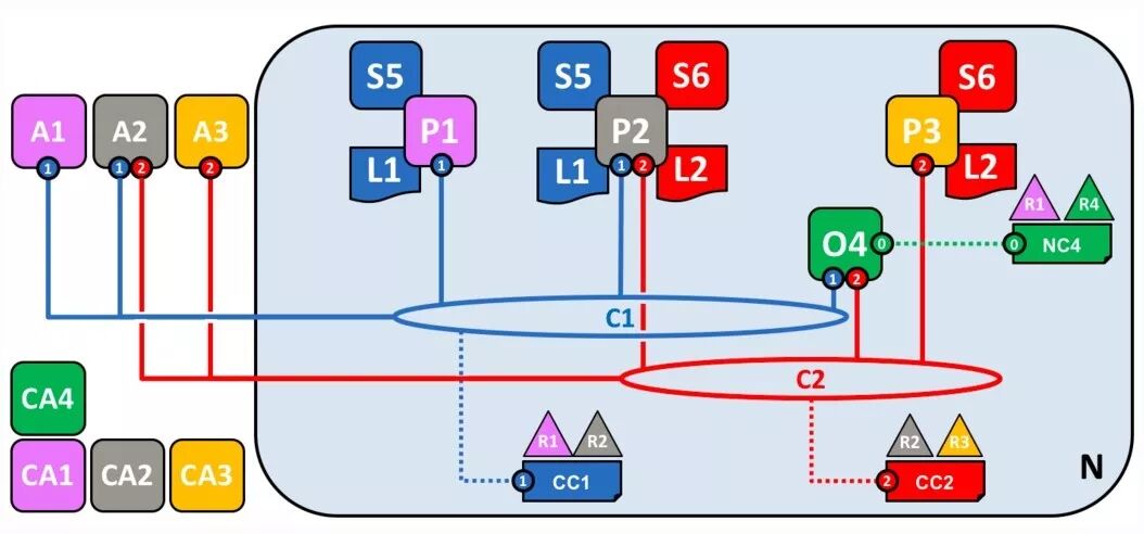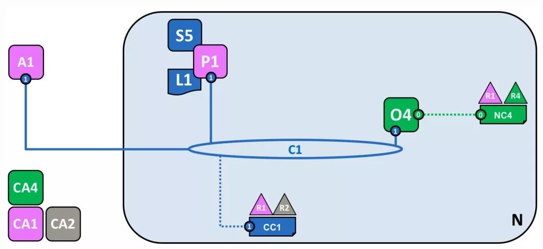 在联盟的基础上,就可以创建 channel 了。C1 表示 channel ,根据CC1 创建。它是联盟内部成员之间的主要通信机制。这里联盟内有 R1 和 R2,CC1 由它们控制,R4 不能参与。注意,C1 需要与 O4 相连。这样的目的是,只要能连上 O4,就能与 C1 连接的节点通信。