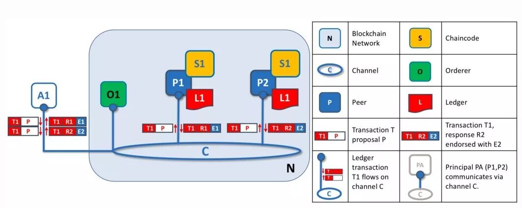 A1生成 Transaction T1 带 proposal P,然后发给 channel C 上的 P1 和 P2 。P1 执行 S1 使用 T1 带 P,以 R1 带 E1 相应。P2 执行 S1 使用 T1 带 P,以 R2 带 E2 相应。A1 收到这两个响应。