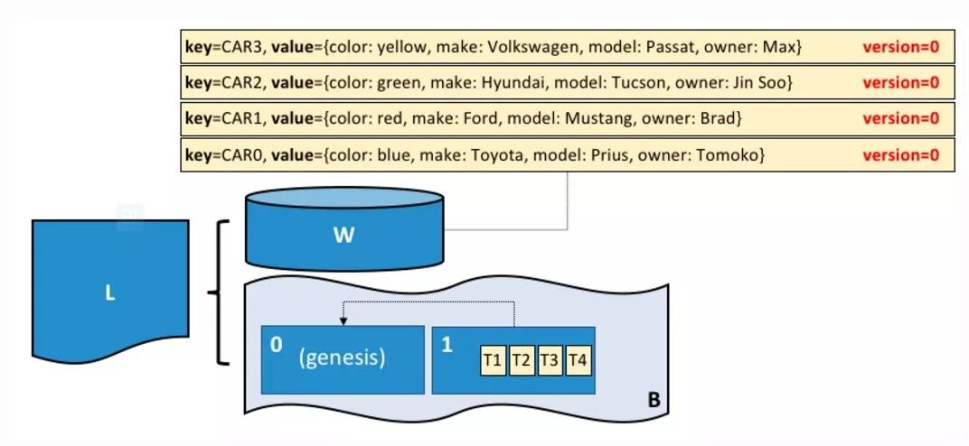 账本 L 包括一个 world state W 和一个区块链 B 。W 包含4个状态,key 是 CAR1、CAR2、CAR3 和 CAR4。B包含两个blocks:0 和 1。Block 1 包含4个 Transactions T1、T2、T3、T4。
